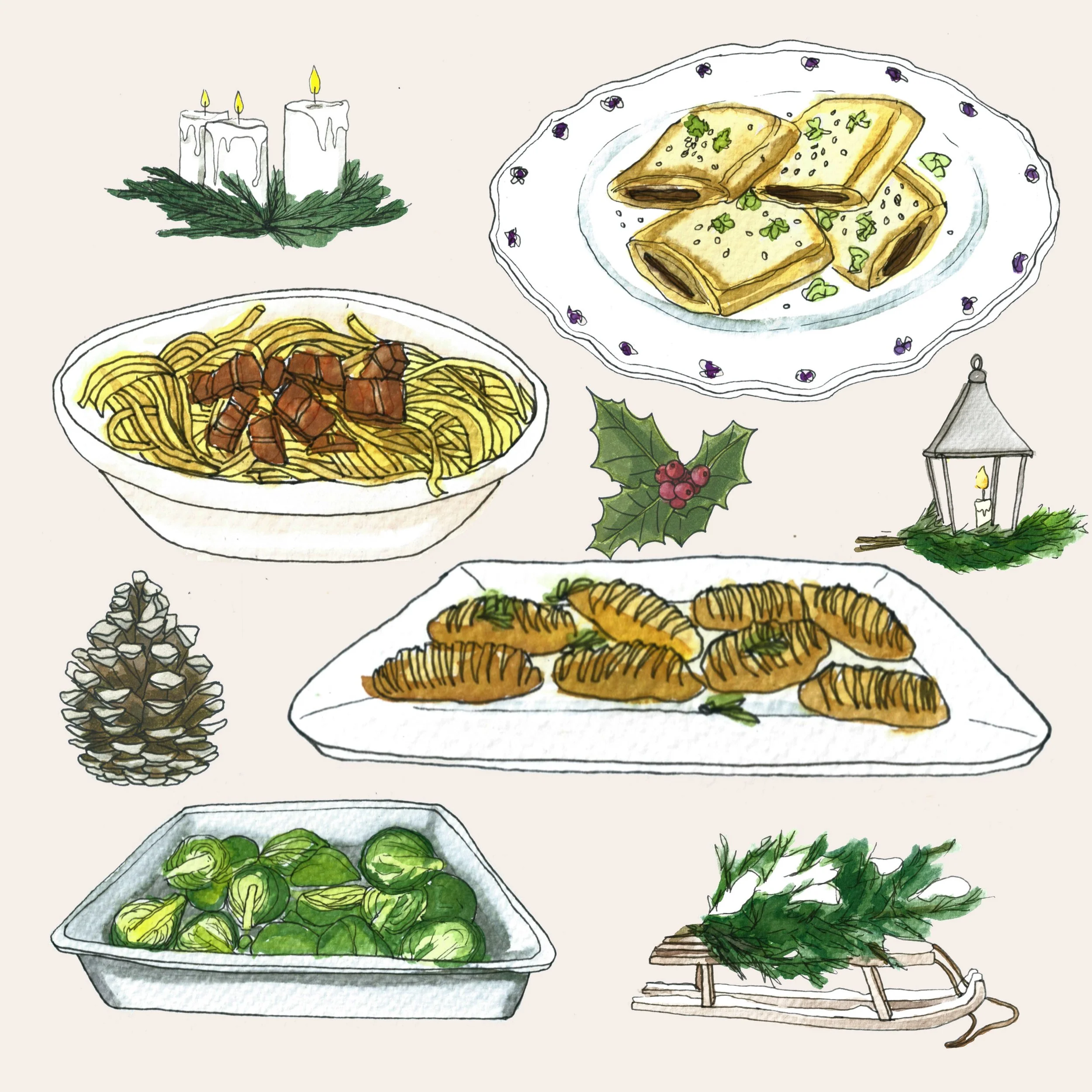 Cette année nous avons décidé de nous faire un petit Noël tous les cinq avant de démarrer les festivités. Nous avons réfléchi à un menu tous ensemble. Nos filles souhaitaient manger les pâtes carbonara que leur papa cuisine si bien. Je lui ai demandé de vous partager sa recette ci-dessous. Et de notre côté nous avions envie d’un repas plus festif. J’ai cuisiné un genre de feuilletés champignons châtaignes que je me suis réapproprié à ma façon, accompagné de choux de Bruxelles rôtis au four et de pommes de terre à l’huile d’olive découpées en fines tranches