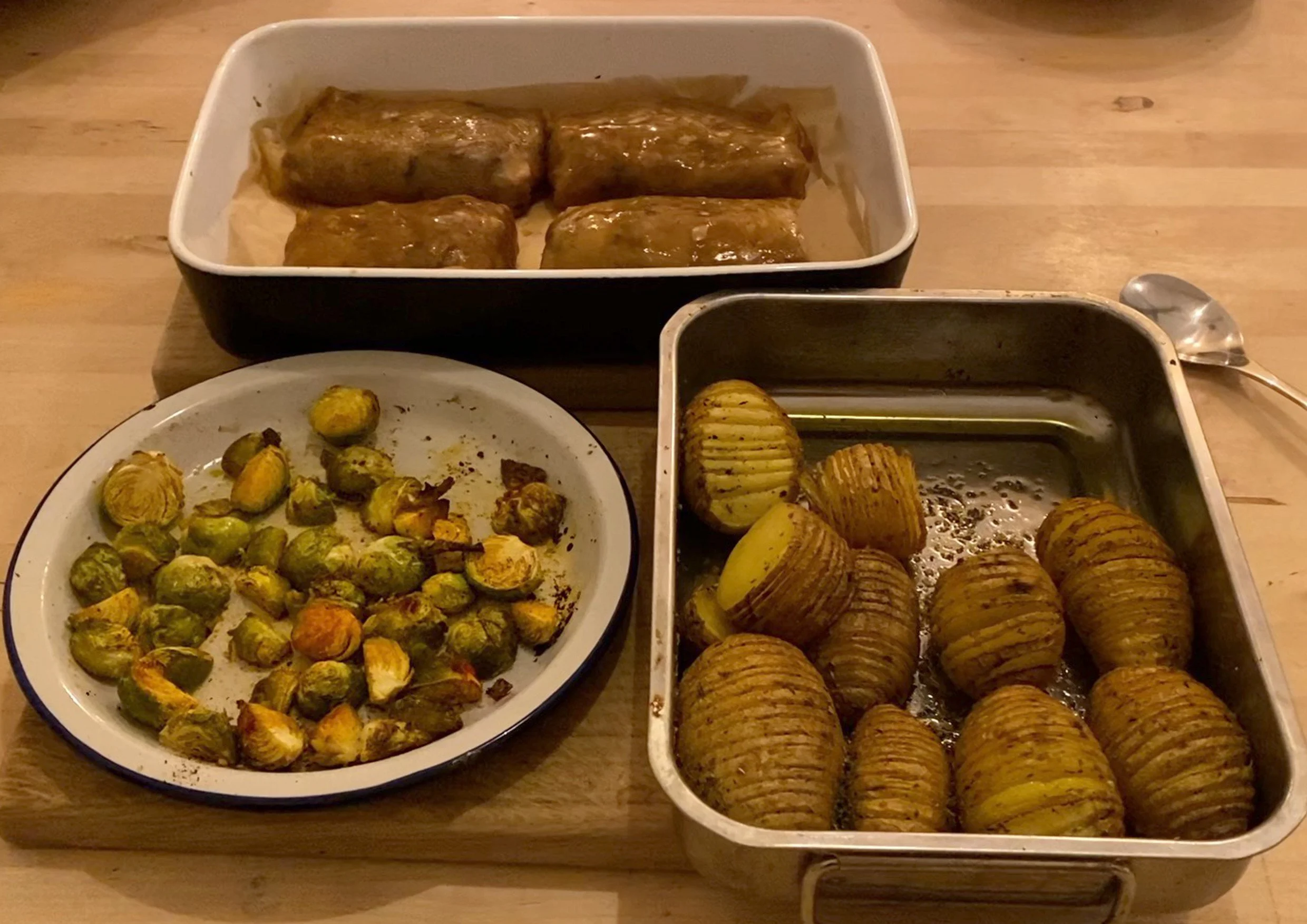 Pour les pommes de terre, j’avais choisi de les découper partiellement en fines tranches mais en les gardant entières. Comme dans ma vidéo. Je les ai arrosées d’huile d’olive et j’ai assaisonné avec des herbes de Provence, sel et poivre. Je les ai fait cuire une heure environ en même temps que les choux de Bruxelles